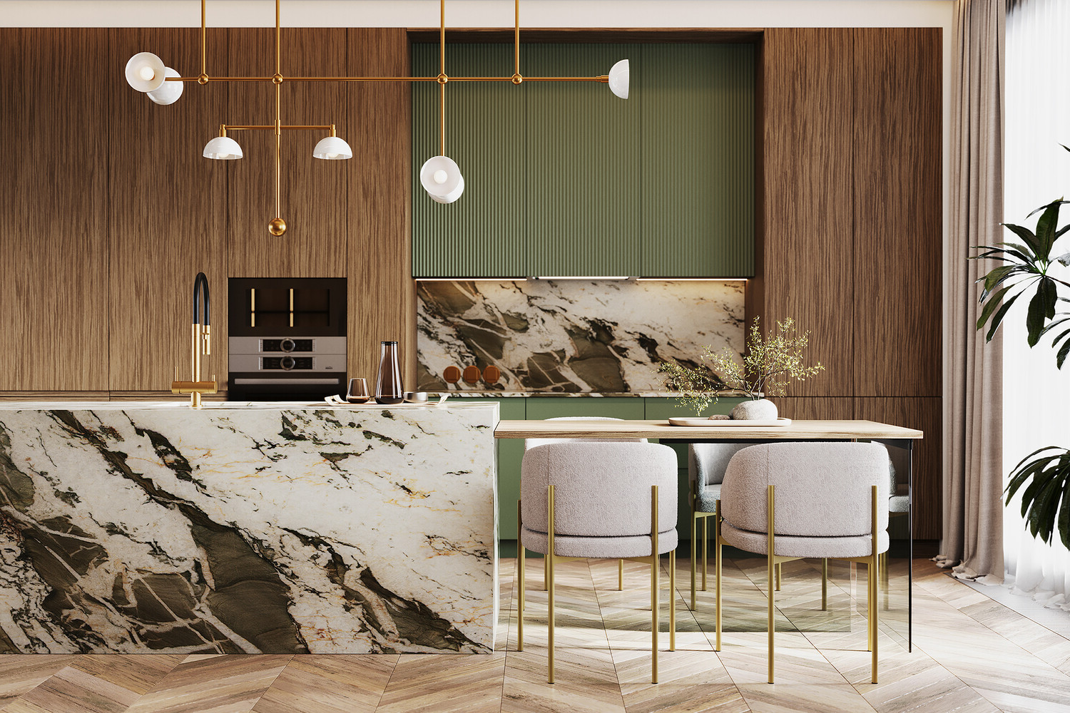 В такой эстетике кварцевый агломерат Vicostone становится ключевым материалом: он выглядит как природный камень, но устойчив к влаге, царапинам и времени.